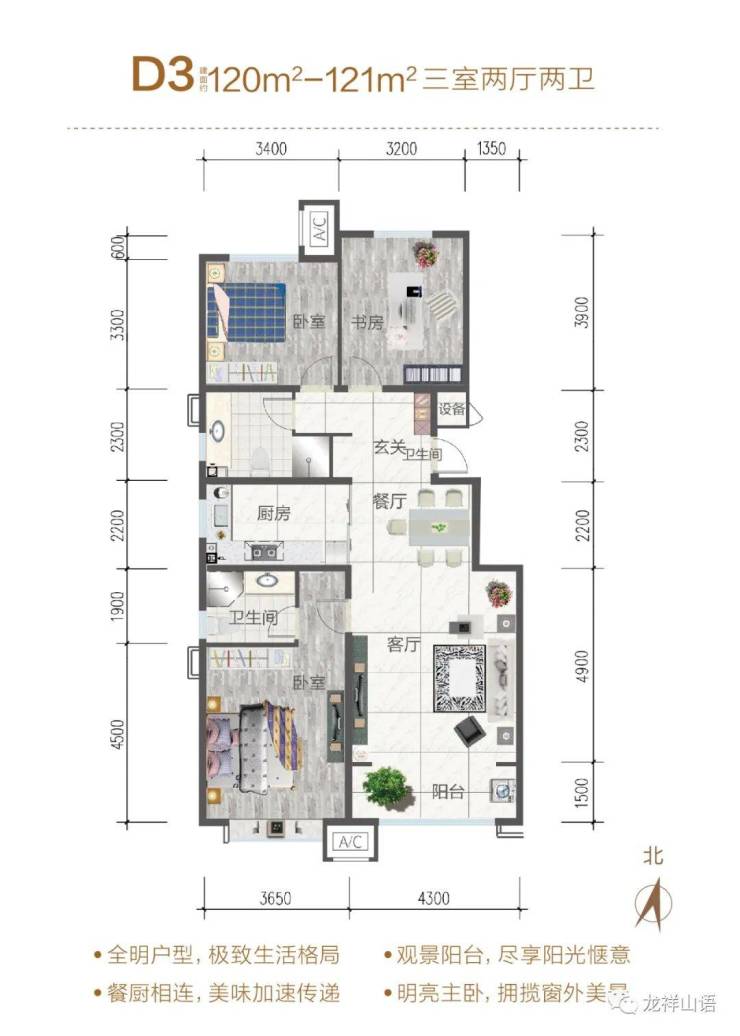 建面约120㎡三室两厅两卫户型进入室内,约4.3米开间的餐客一体宽敞客厅格外醒目,外接观景大阳台,让室内的生活空间得到延伸。套房式主卧,独立卫浴,让私享起居空间发挥自由设计,飘窗榻榻米、个性梳妆台都可实现。北侧书房,在书香与音符中与孩子一起阅读,绘画,互动游戏,其乐融融。