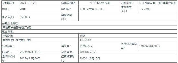 12月15日上午9点50分,位于长江西道以南、规划南岭路以东的两宗相邻住宅用地完成挂牌出让。