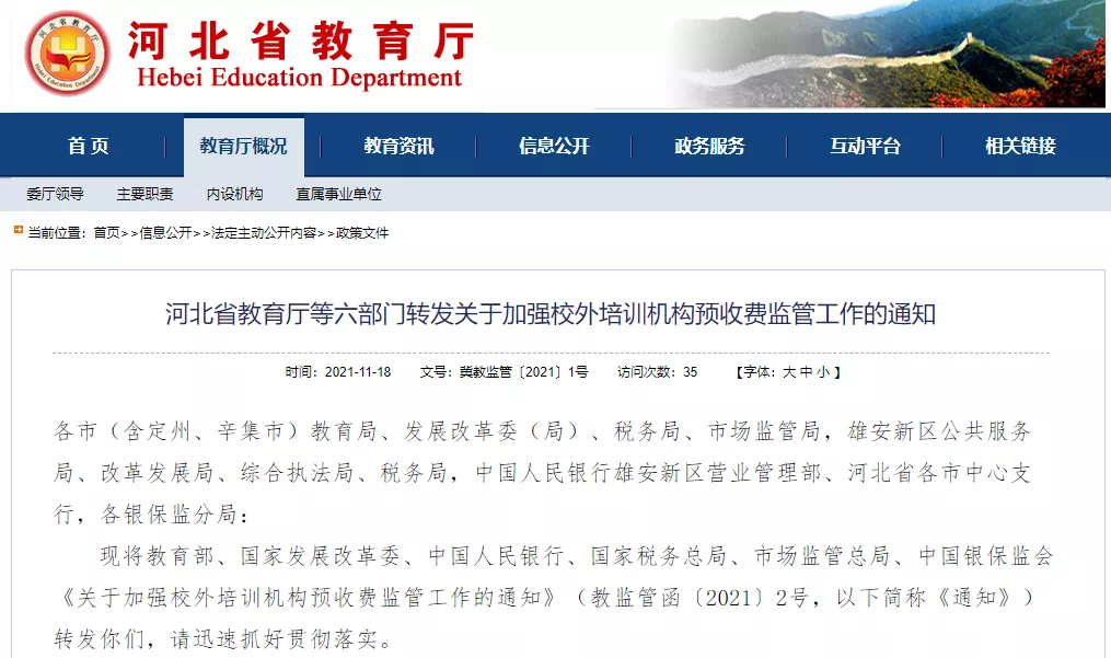 河北省教育厅等六部门转发关于加强校外培训机构预收费监管工作的通知