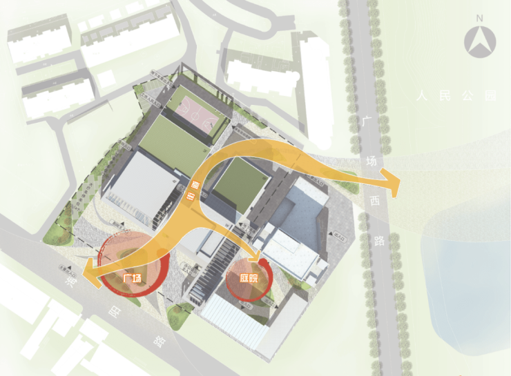 同时,对新建文化宫东侧的现存建筑进行改造,三组建筑围合形成东部内庭院空间,在建筑中部底层架空。