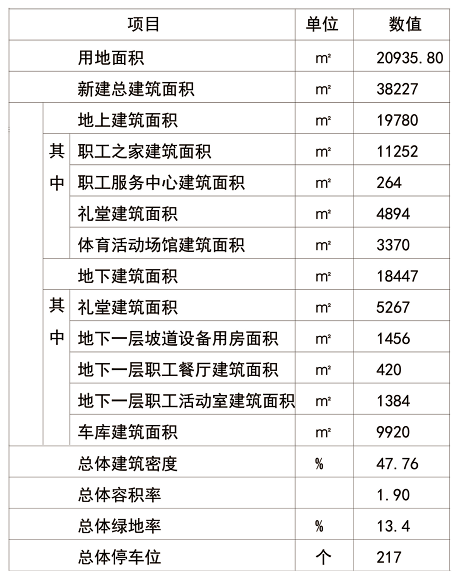 项目规划用地面积20935.80㎡,新建总建筑面积38227㎡(其中地上建筑面积19780㎡、地下建筑面积18447㎡),总体建筑密度47.76%、总体容积率1.90、总体绿地率13.4%、车库建筑面积9920㎡、总体停车位217个。