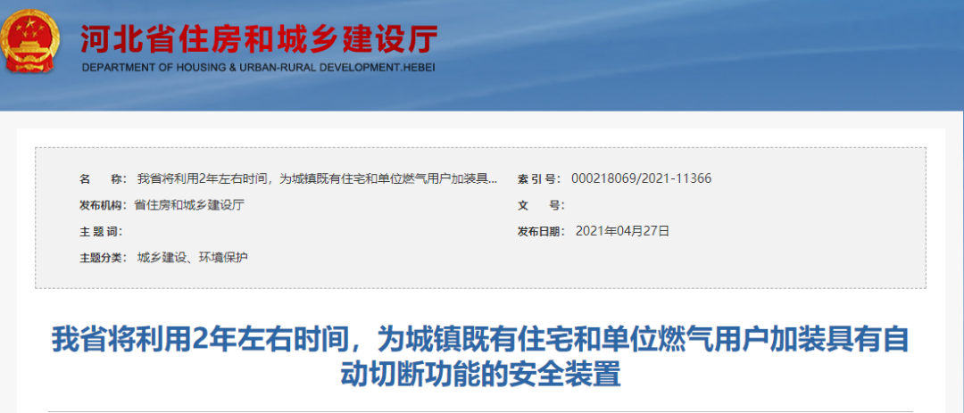 日前,河北省发布公告称,将在两年内,为全省住宅和单位燃气用户,安装自动切断功能的安全装置。