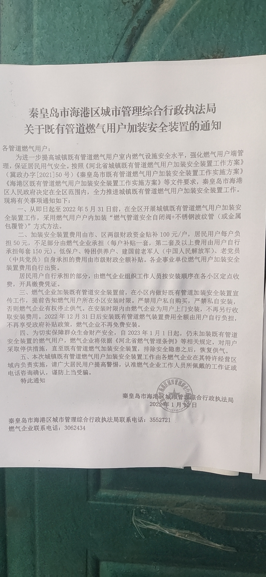 1、海港区、北戴河区、山海关区、北戴河新区、抚宁区城镇既有管道燃气住宅用户加装费用由财政补贴100元/户,居民自行承担50元,剩余部分由燃气企业承担。