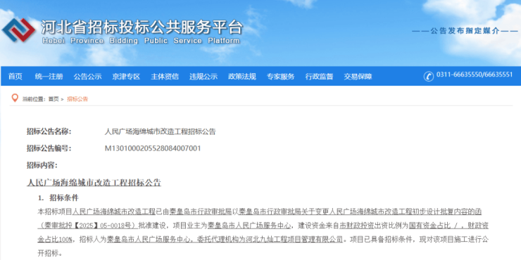 日前,河北省招标投标公共服务平台发布《人民广场海绵城市改造工程招标公告》,拟对人民广场及康乐街北侧实施改造及配套设施工程建设。详情如下: