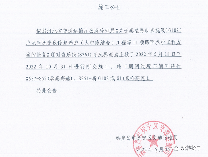 对于抚宁人来说这是一个年度较好消息:2022年5月18日至10月31日进行断交施工,施工路段为青抚边界至袁庄段。