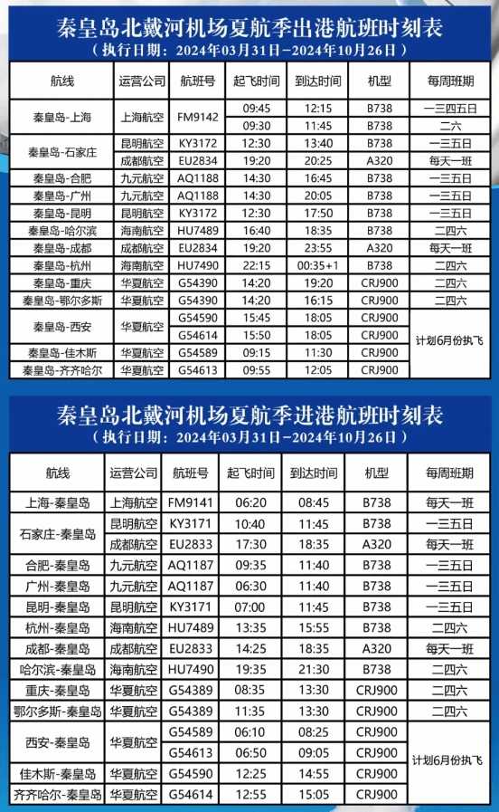 具体时刻为:FM9143/4,18:20从上海起飞,20:40到达秦皇岛,21:40从秦皇岛起飞,次日00:50到达上海。