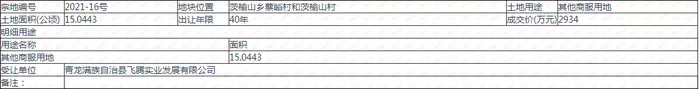11月13日,青龙满族自治县茨榆山乡编号为2021-16号地块成交,由青龙满族自治县飞腾实业发展有限公司以底价2934万元摘得,宗地总面积为150443㎡,位于茨榆山乡蔡峪村和茨榆山村,容积率为1.5,建筑面积为225663㎡,土地用途为其他商服用地。
