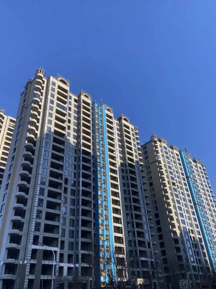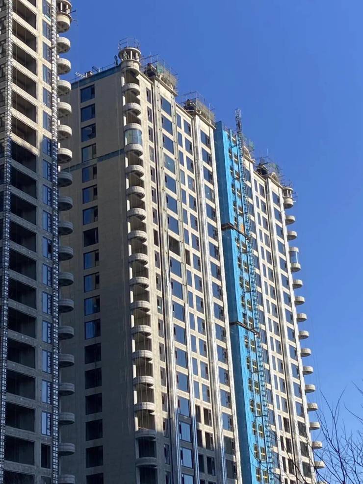 项目楼栋主体结构已基本成型,错落有致的窗户框架安装完毕,为建筑勾勒出清晰的轮廓线。部分楼体已开始进行外墙作业,浅色板材与灰色瓷砖相结合的外立面初步呈现,现代简约的建筑风格跃然眼前。