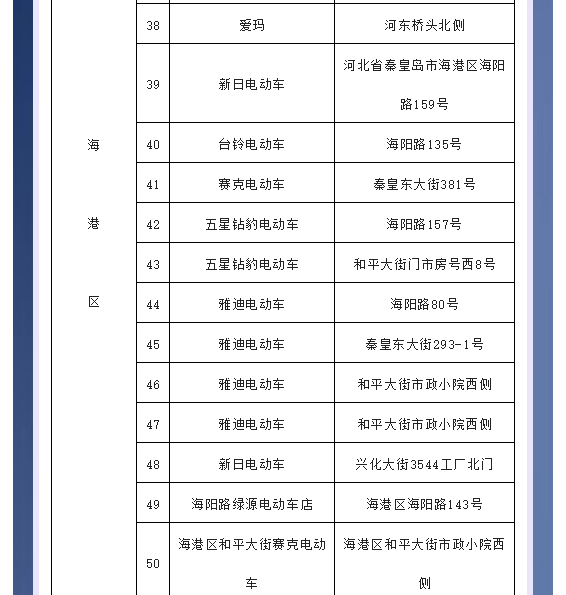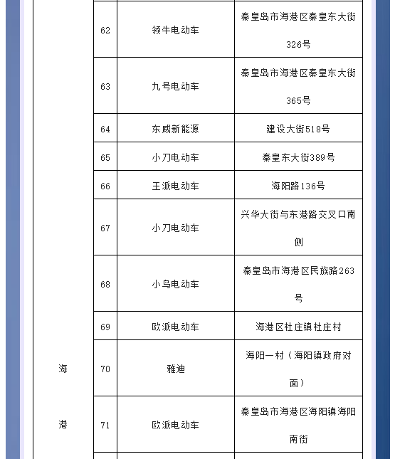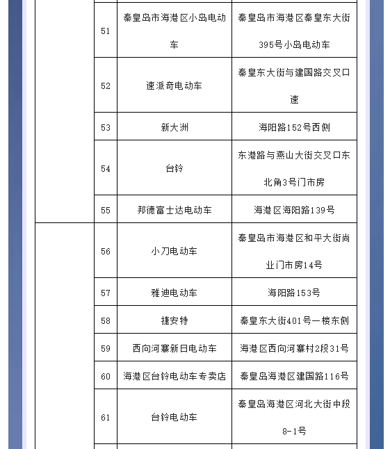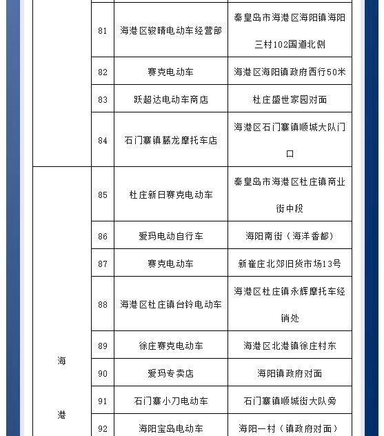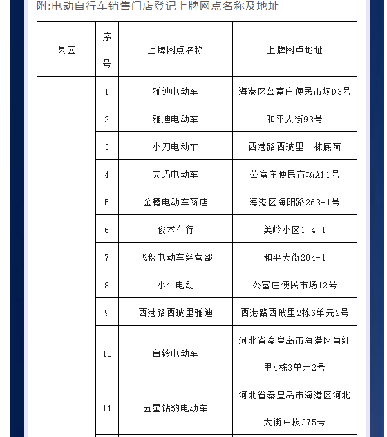 为进一步满足广大市民就近办理电动自行车登记上牌需求,6月1日起,我市在海港区、山海关区、北戴河区、开发区、北戴河新区的电动自行车销售门店开通了登记上牌业务,新增登记上牌业务网点144个。广大市民可选择线上办理或携带相关手续资料就近现场办理电动自行车登记上牌业务。