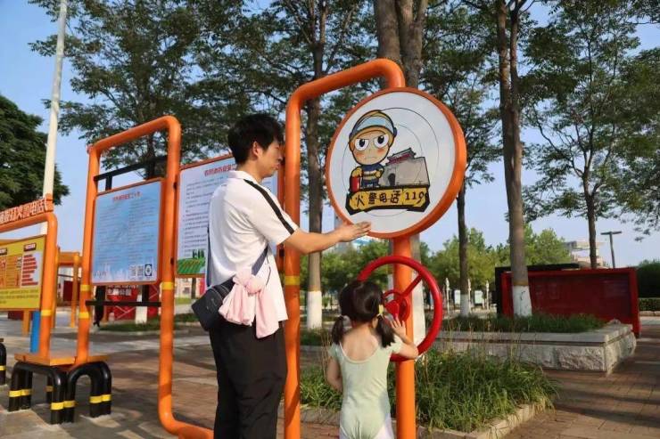 公园内设置了消防主题造型、消防知识宣传栏、消防提示牌、消防健身器材、消防滑梯等多个区域。