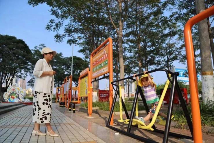 消防知识宣传展板造型的椅子和健身器材受到老年人欢迎。