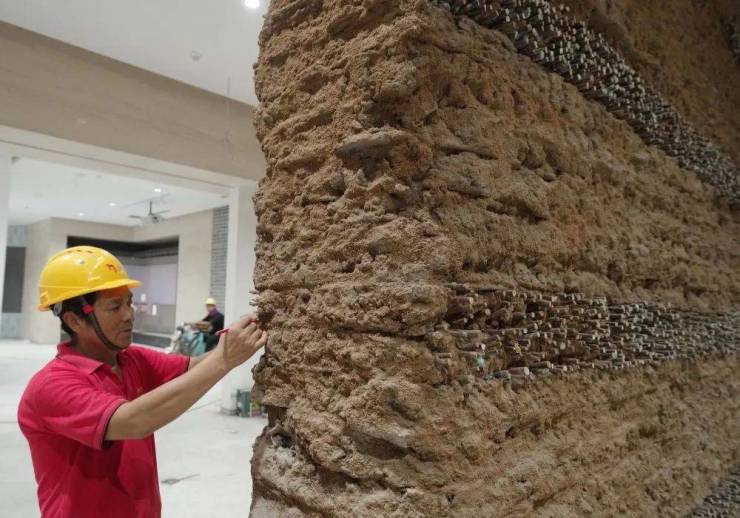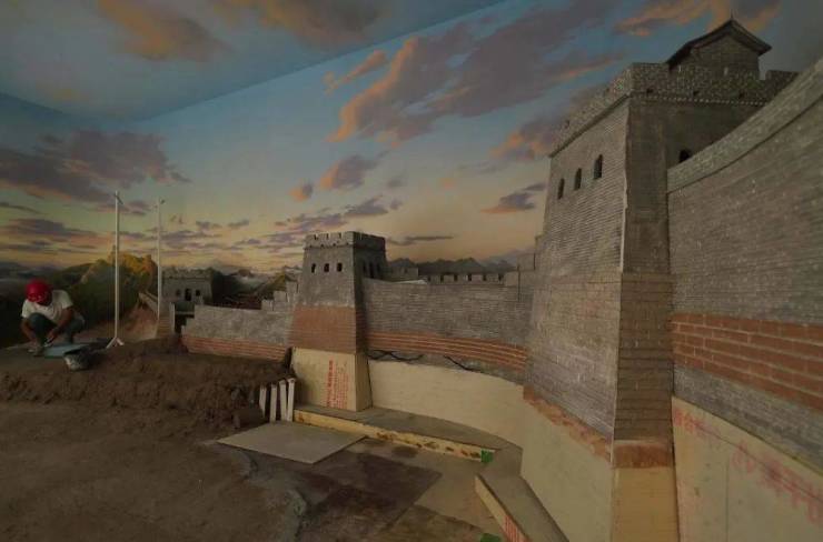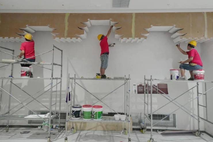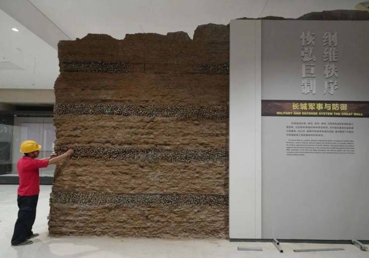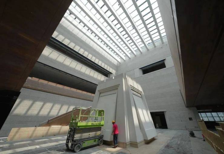 ↑8月4日,工人在山海关中国长城博物馆进行内部装修施工。新华社记者杨世尧摄