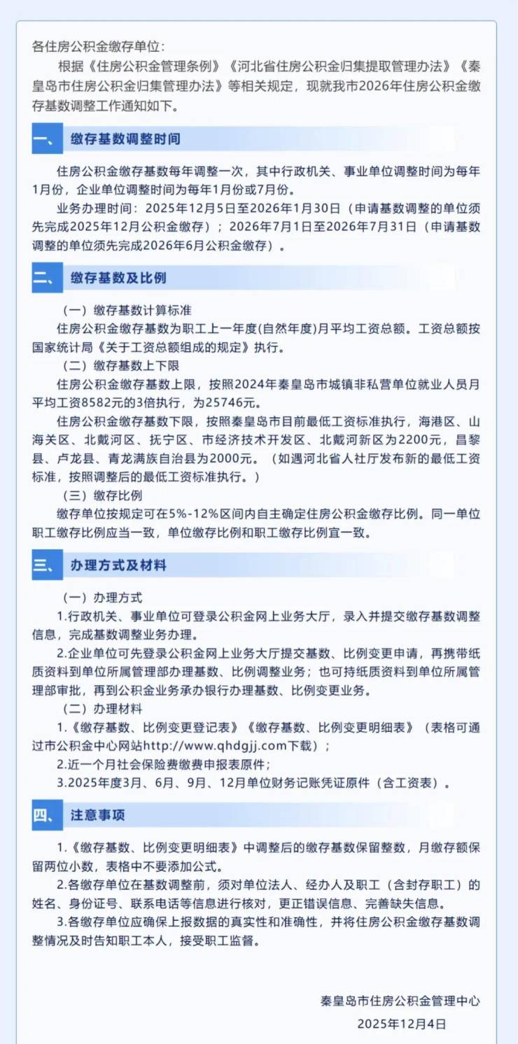 秦皇岛市住房公积金管理中心于2025年12月4日发布《关于2026年住房公积金缴存基数调整的通知》,明确了明年住房公积金缴存基数的调整时间、上下限标准以及具体办理方式。
