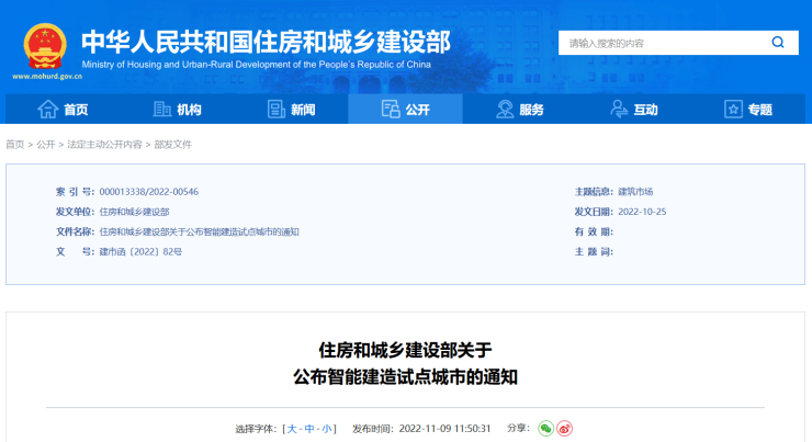 央广网北京11月10日消息 据住房和城乡建设部网站消息,为贯彻落实党中央、国务院决策部署,大力发展智能建造,以科技创新推动建筑业转型发展,经城市自愿申报、省级住房和城乡建设主管部门审核推荐和专家评审,住建部发布有关通知,决定将北京市等24个城市列为智能建造试点城市,试点自公布之日开始,为期3年。