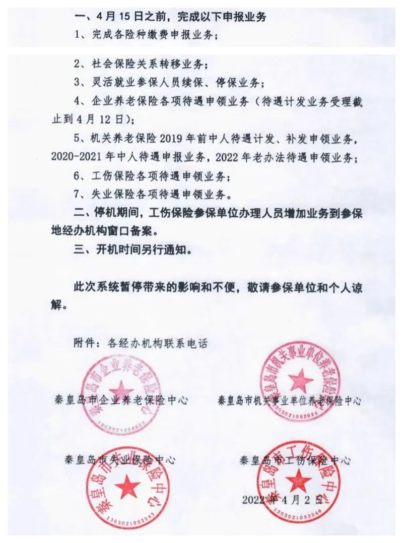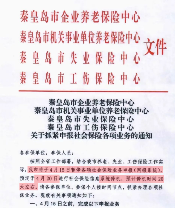 秦皇岛市4月15日起暂停各项社保业务申报!预定4月20日起进行社保信息系统停机!