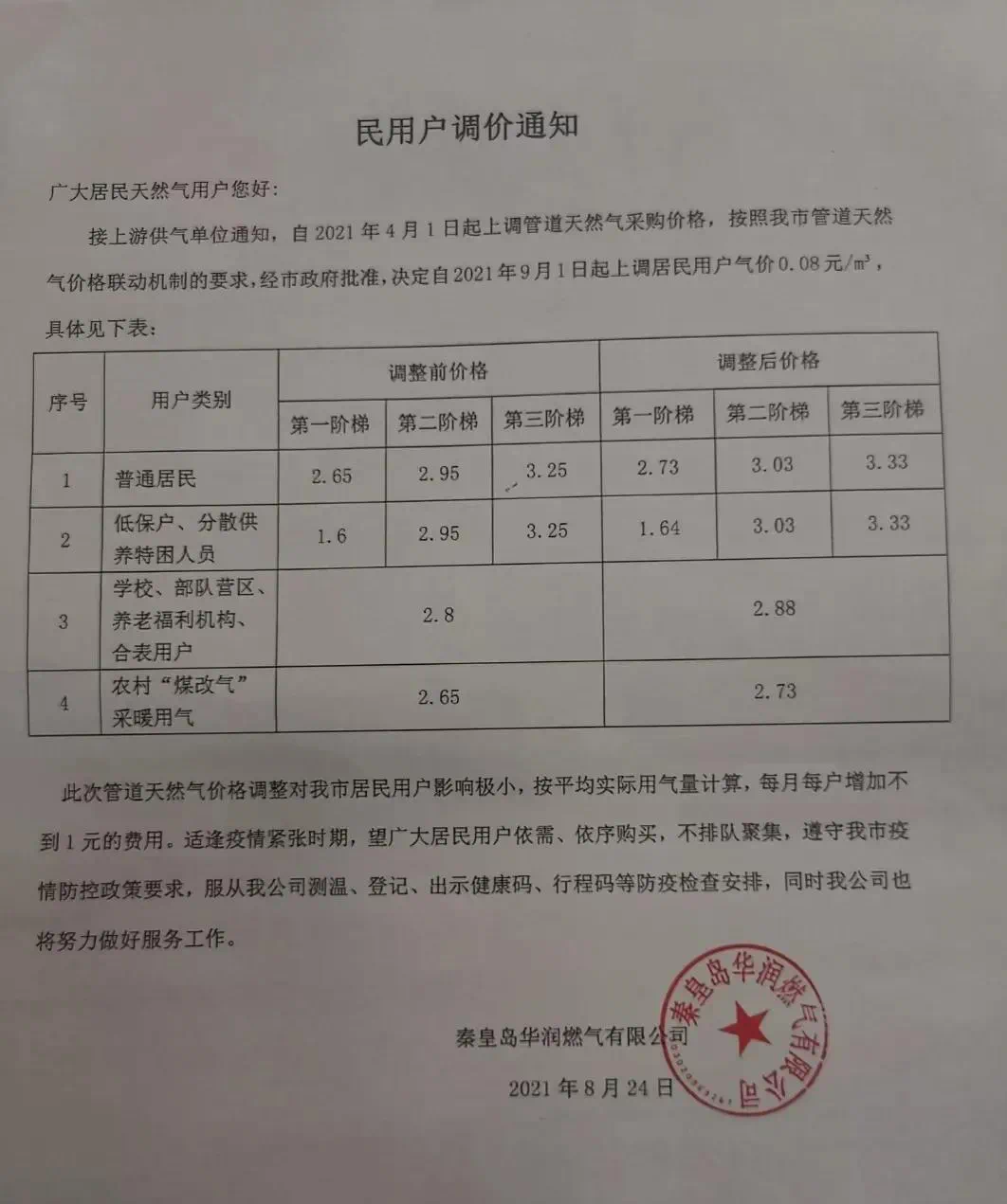8月24日,秦皇岛华润燃气有限公司发布公告,自9月1日起上调居民用户气价0.08/㎡,原2.65上调后2.73。