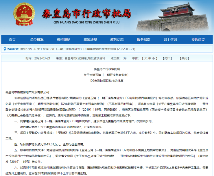 据秦皇岛市行政审批局网站公布的消息显示,同意秦皇岛市鼎威房地产开发有限公司建设金港玉湾(一期开滦路商业街)D2电影院项目。
