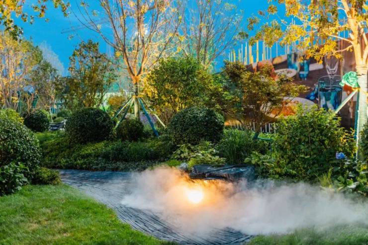 南侧为1200㎡的森岛园,以庭、廊、水系、阳光草坪以及密林相结合形成林间山水的意境,整体氛围更静谧;同时廊架作为南入口对景,通过水景结合山石、岛屿,在背景logo的映衬下,营造“落日归山海 烟火向星辰”此般多喜乐、常安宁的意境。