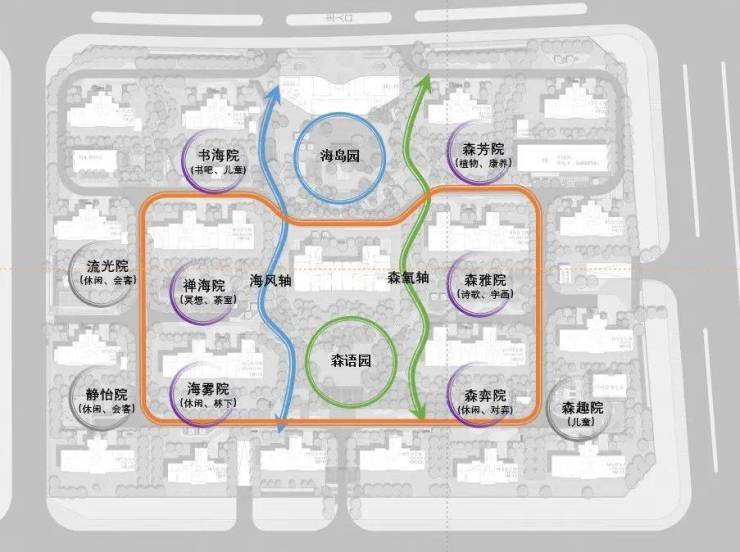 从园林布局上看,整体通过一环(怡和环-健康步道)、两轴(海风轴、森氧轴)、两园(海岛园、森语园)、九院(君子八雅-琴棋书画诗香花茶+一个全龄儿童活动院落)将园区景观串联,随处可见海浪与岛屿的元素。园林整体路径以综合楼为源头,向内呈树枝型蔓延铺开,并以折线结合岛屿的形式贯穿全园。