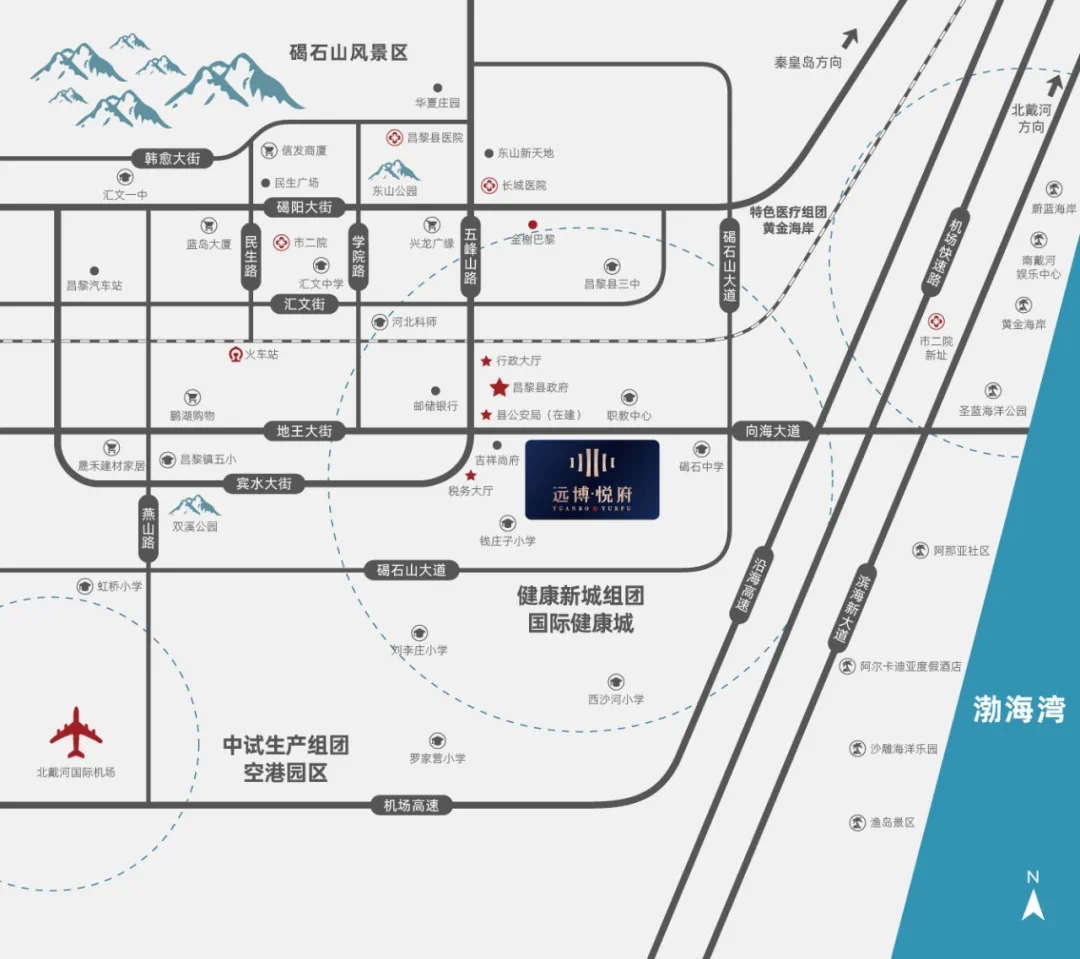 北邻主干交通道路,紧靠北戴河新区,临近沿海高速以及机场快速路等多维路网,交通便捷快速,彰显潜力价值。