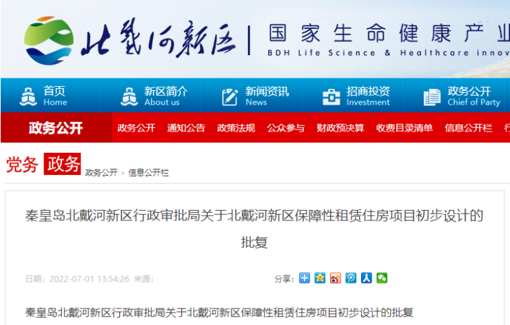 往前追溯,7月1日北戴河新区政府官网曾发布《秦皇岛北戴河新区行政审批局关于北戴河新区保障性租赁住房项目初步设计的批复》。