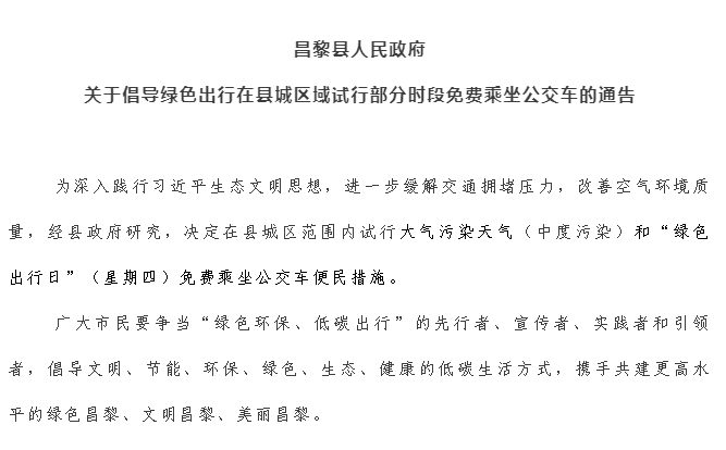 经县政府研究,决定在县城区范围内试行大气污染天气(中度污染)和“绿色出行日”(星期四)免费乘坐公交车便民措施。