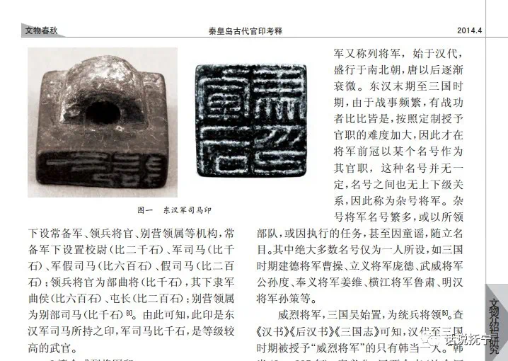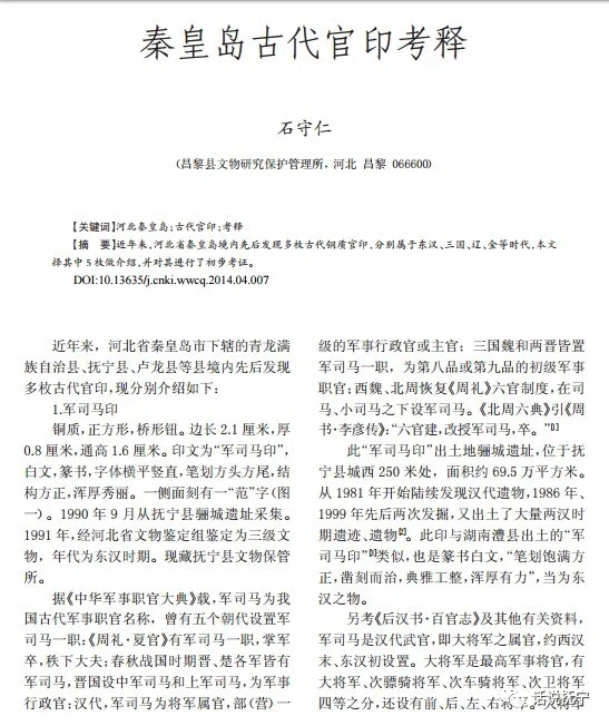 抚宁文物专家吴环露、袁秉成在《考古》杂志1999年第3期上发表的文章,介绍抚宁发现“军司马”印的重大意义。