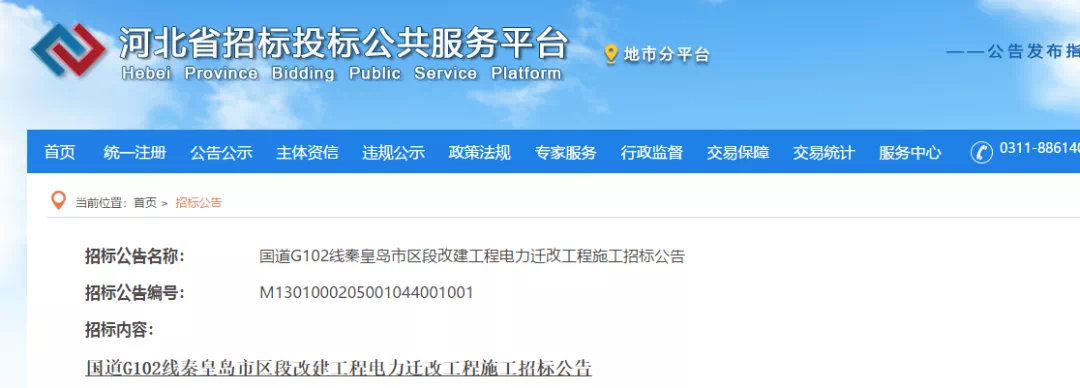 近日,河北省招标投标公共服务平台发布《国道G102线秦皇岛市区段改建工程电力迁改工程施工招标公告》,具体招标情况如下: