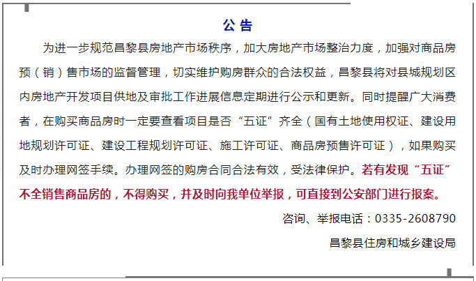 昌黎县住房和城乡建设局发布公告若发现“五证”不全销售商品房的不得购买并及时向住建局举报可直接到公安部门进行报案来源:昌黎县住房和城乡建设局…