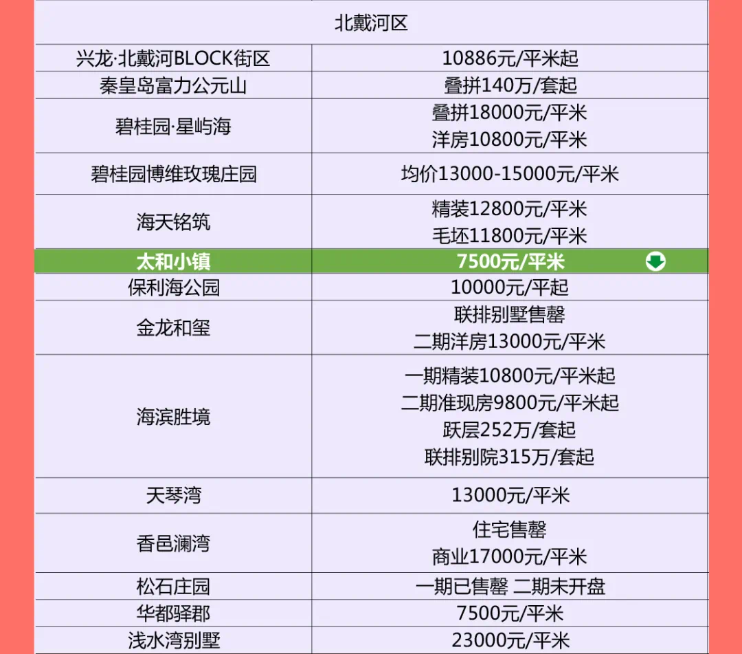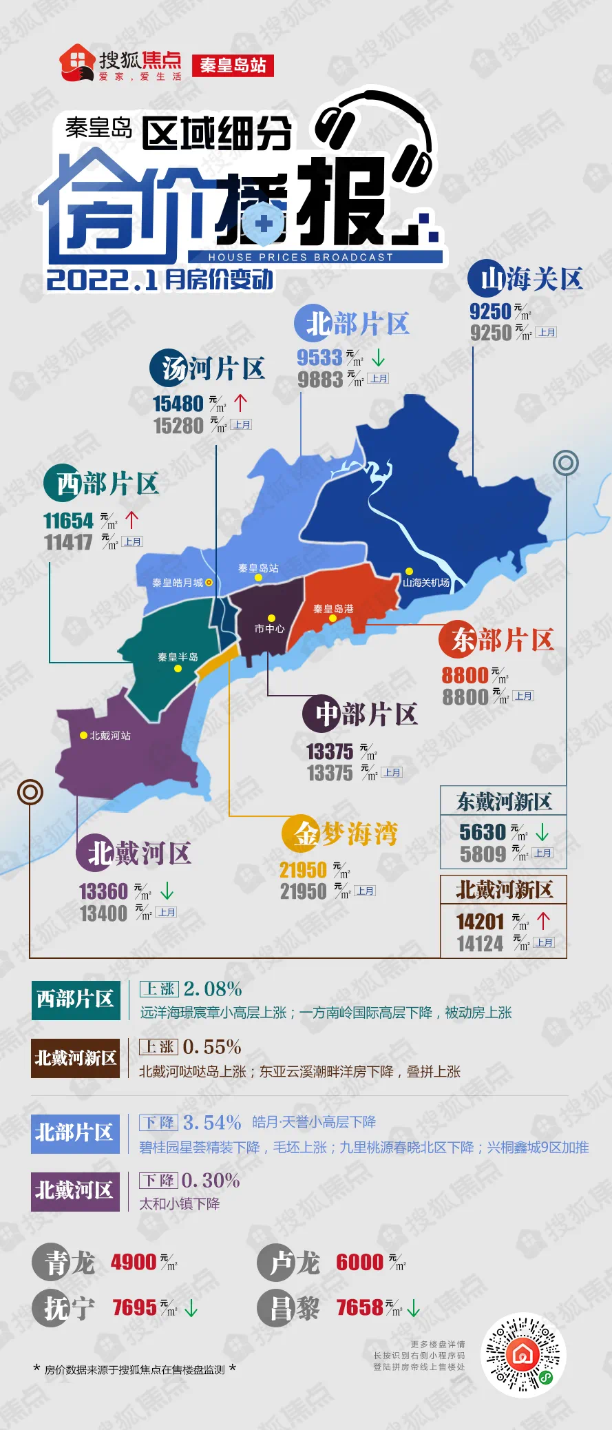 从片区来看,6个片区房价环比持平、5个片区房价下跌,3个片区房价上涨,上涨的片区分别是汤河片区、西部片区和北戴河新区。