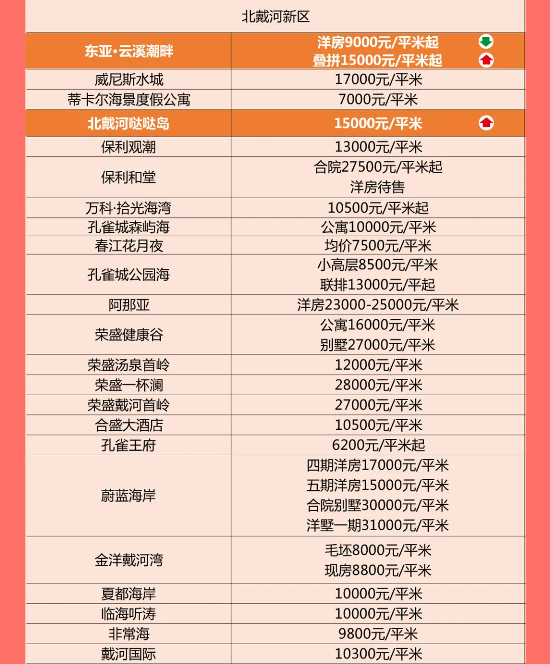 △点击可放大查看从楼盘数量来看,5个楼盘房价上涨,6个楼盘房价下跌。其中,海港区和北戴河新区的两个楼盘房价涨幅相对较大,分别是:远洋·海璟宸章(小高层均价17000元/㎡,上涨21.43%)、北戴河哒哒岛(公寓均价15000-16000元/㎡,上涨11.11%);房价下跌的区域主要集中在市区的北部板块,降幅相对较大的楼盘为:皓月·天誉(小高层均价10000元/㎡,连续两个月下跌,环比下跌4.76%)
