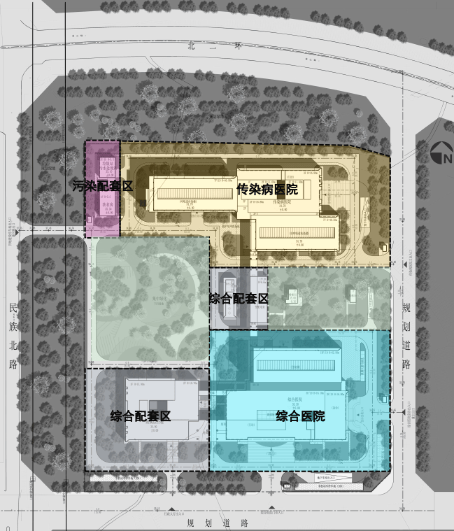 该项目总用地面积约为100亩,拟采用装配式建筑,主要建设内容为综合医院、传染病医院、附属综合楼、零星病例隔离楼、辅助用房等。床位共800张,其中综合医院400张,传染病医院400张。