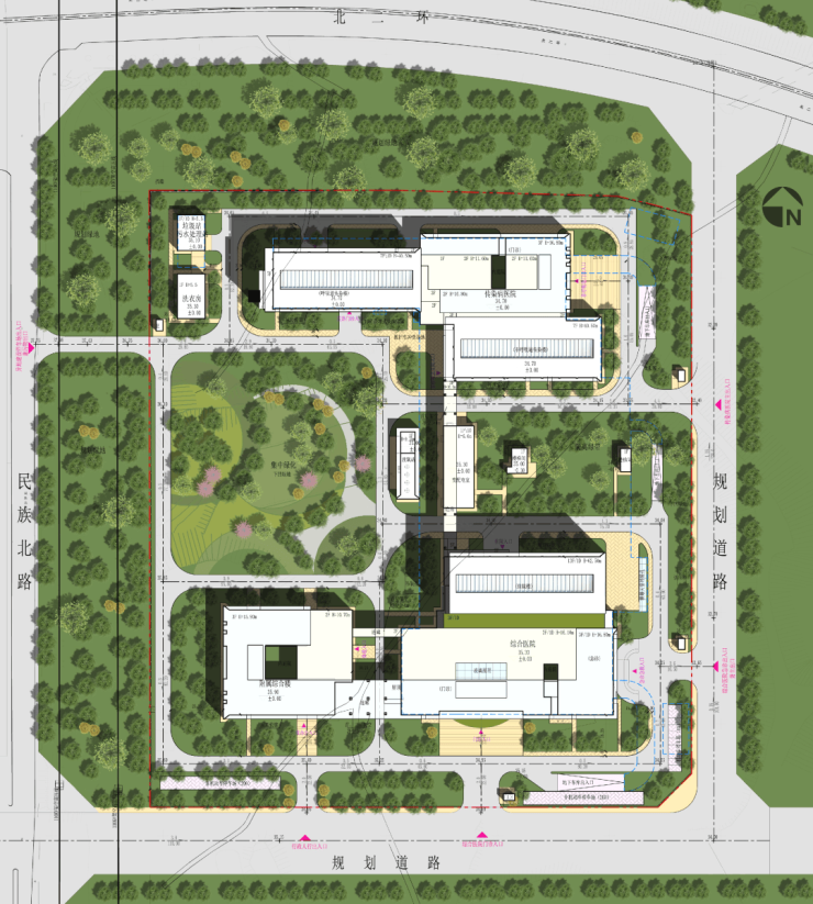 据此,该院设计方案旨在喧嚣的城市环境与繁忙的医疗建筑之间创造出一个“绿岛”:在求医的“航程”中,这一“绿岛”可以让医护人员得以喘息和休憩,让病患得以感受生机与活力,也可以称之为“生命之岛”。