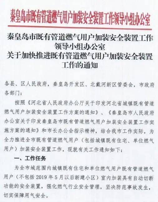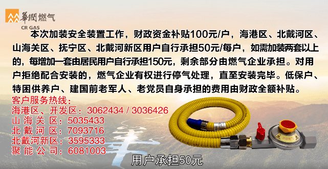 1、海港区、北戴河区、山海关区、北戴河新区、抚宁区城镇既有管道燃气住宅用户加装费用由财政补贴100元/户,居民自行承担50元,剩余部分由燃气企业承担。