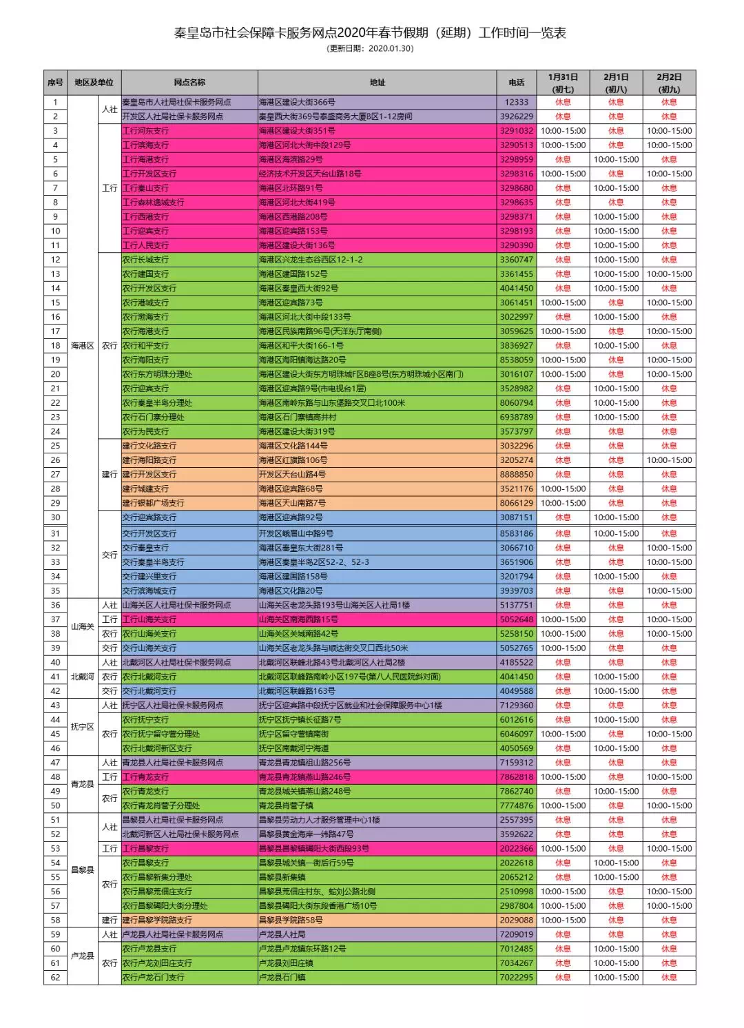 根据《国务院办公厅关于延长2020年春节假期的通知》,延长2020年春节假期至2月2日(农历正月初九,星期日),2月3日(星期一)起正常上班。在此期间,全市各社保卡服务网点工作时间如下(点击图片可放大):