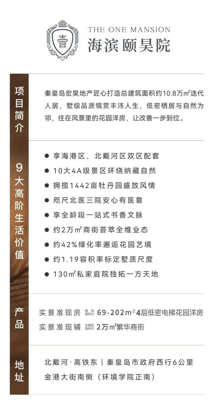 海滨颐昊院择址北戴河稀贵盛境,以国际化大都市生活样本为坐标,融合北戴河独特生态资源,自创“居+境+景+游+商”生态人居模式。内拥4层低密电梯花园洋房、约2万㎡欧式主题公园、总建面约2万㎡繁华商街,外观京津冀景区级牡丹园,丰沛北戴河旅游度假资源。周边幼、小、初、高、大学全龄段一站式书香文脉汇聚,近享北医三院、北戴河医院、281 医院、秦皇岛第一医院体检中心四大醇熟医疗配套,无忧生活尽在掌握。