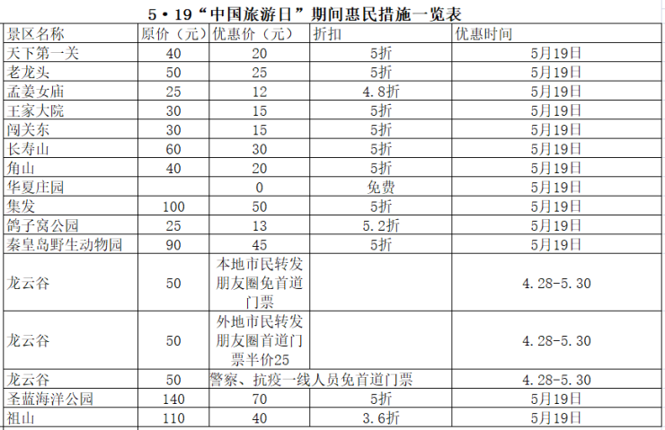 5.19中国旅游日当天,鸽子窝、野生动物园、天下排名前列关、老龙头、角山、长寿山、孟姜女庙、闯关东文化体验园、王家大院、钟鼓楼、迎恩楼、望洋楼等多家景区半价。