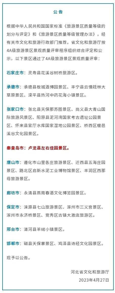 近日,河北省文化和旅游厅发布公告,河北22家景区通过4A级旅游景区景观质量评审。卢龙县左右佳园景区榜上有名。