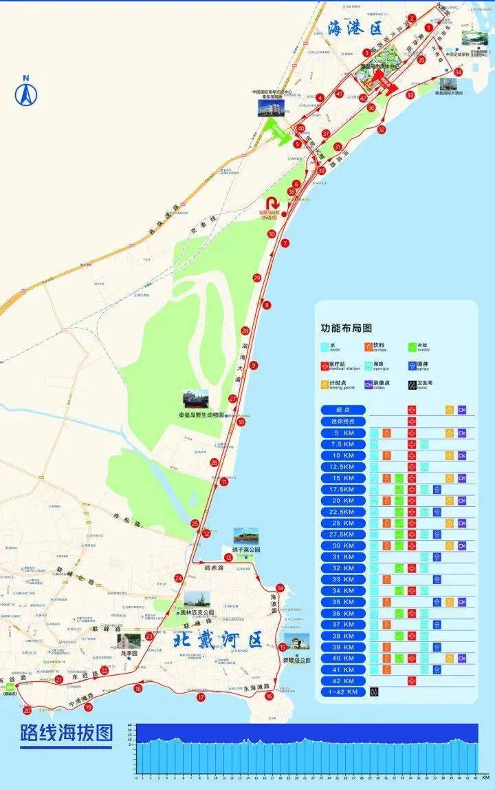 全程赛道以奥体中心体育场南门为起点,途经奥体街向东-至文体路左转-至河北大街西段左转向西-至与滨海大道交叉口左转向南-至山东堡桥-至滨海大道-至鸽赤路-至海波路-至东海滩路-至中海滩路-至西经路右转-至东经路-至滨海大道-至河滨路右转向东-至文涛路左转-至岭前街左转向西-至滨海大道转折点左转上山东堡立交桥-至与河北大街西段交叉口右转-至文昌路右转-至奥体街左转,最后回到终点奥体中心南门。