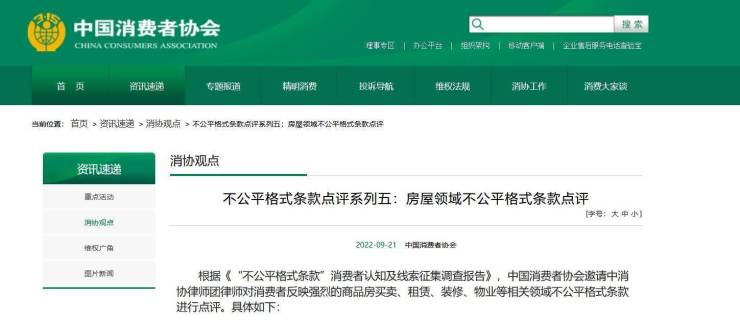 央广网北京9月22日消息 据中国消费者协会网站消息,9月21日,中国消费者协会根据此前发布的《“不公平格式条款”消费者认知及线索征集调查报告》,邀请中消协律师团律师,对消费者反映强烈的商品房买卖、租赁、装修、物业等相关领域十大不公平格式条款进行点评。