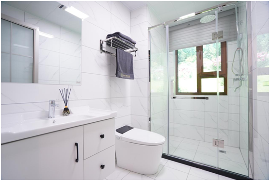 标配智能马桶便捷舒适,浴室柜、整体浴房整洁优雅。卫生间地面防水防渗处理,安心入住,便捷不止一点点。