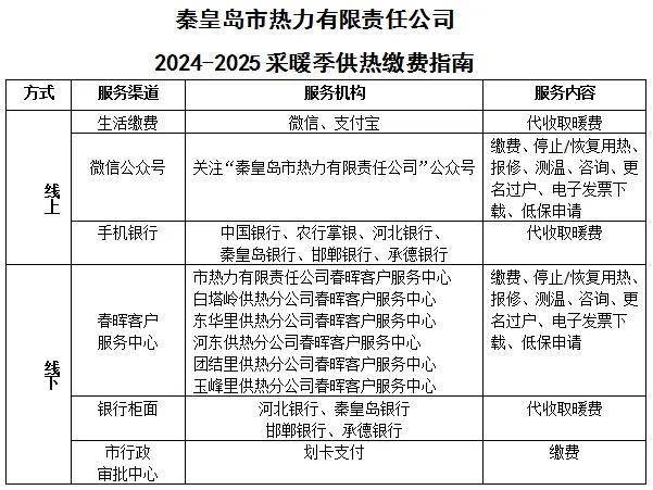 2024-2025采暖季取暖费缴费优惠活动有所调整,居民用户选择线上支付方式一次性缴清当年热费的,可领取一张商超购物券。了解更多活动详情,请关注“秦皇岛市热力有限责任公司”微信公众号发布的活动细则。