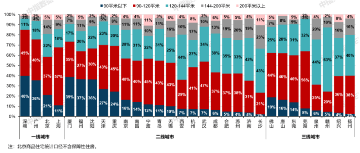以北京为例,从成交面积结构看,1~4月北京90~200㎡产品成交9225套,成交套数占比74.1%,同比提升8.1%。