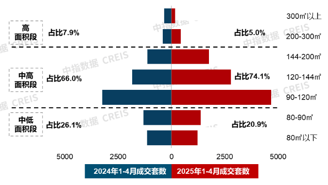 据中指研究院数据显示,今年1-4月,在30个代表城市中,20个城市的120㎡以上住宅成交套数占比提升,改善性需求继续释放。