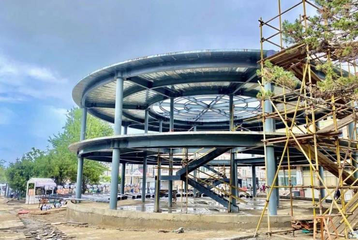 火车文化广场向南大约一二百米,是正在建设的城市书吧,目前书吧主体钢架结构已经全部完工,下一步要进行玻璃幕墙的安装。
