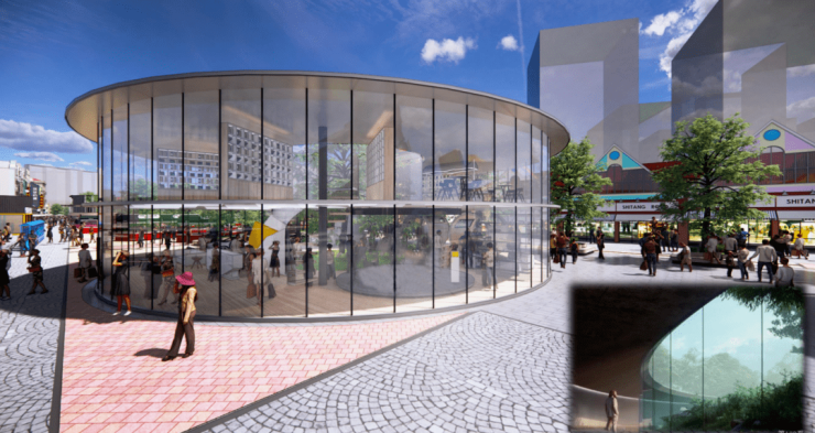 城市书吧的设计初衷是为游客创造一个安静舒适的读书场所,书吧采用环绕式玻璃幕墙,屋顶是玻璃天窗。游客在这里,可观繁华街景,也可仰望蓝天白云。夜晚灯光全部亮起时,书吧看起来就像一个大型的水晶灯,会非常漂亮。