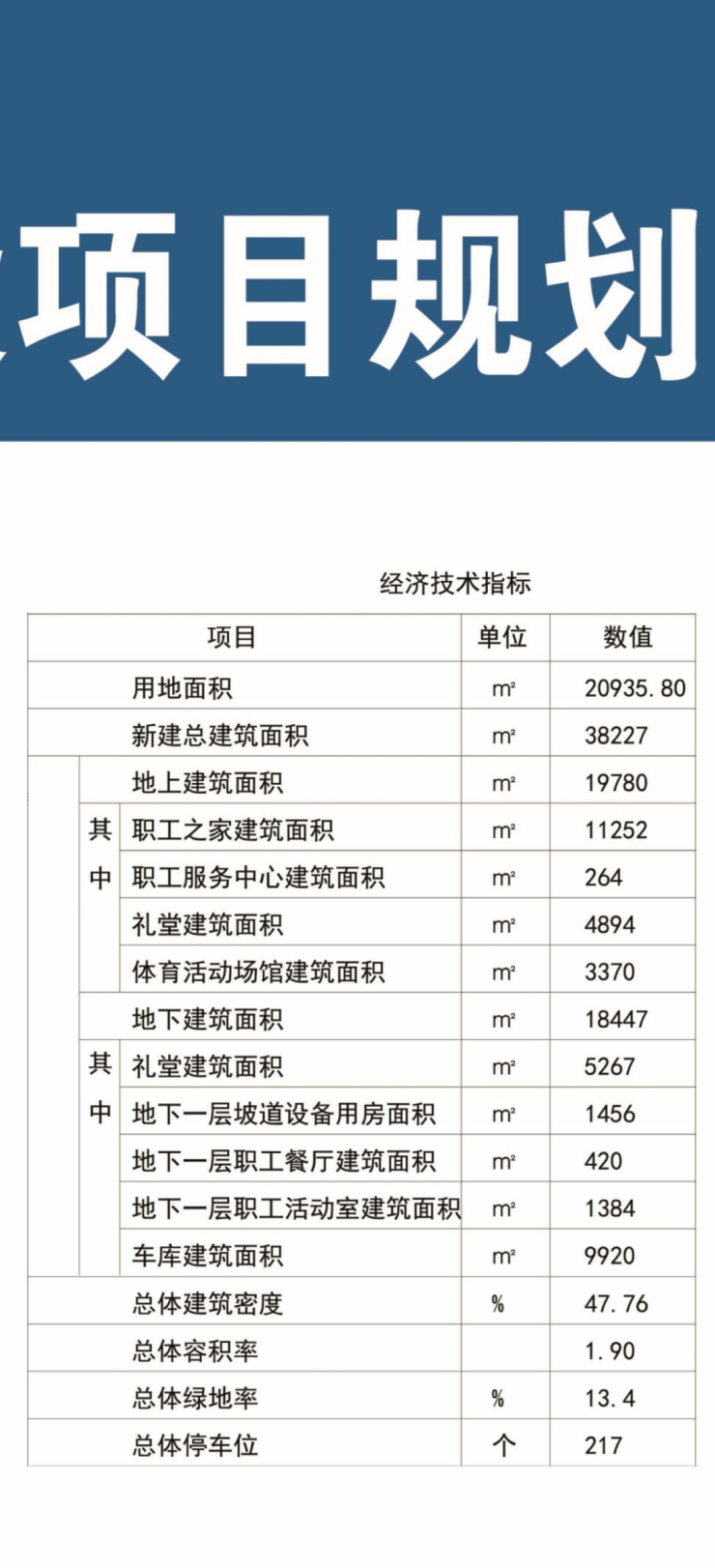 项目新建总建筑面积38227平方米,主要包括礼堂、职工之家、职工服务中心、体育活动场馆、车库等。