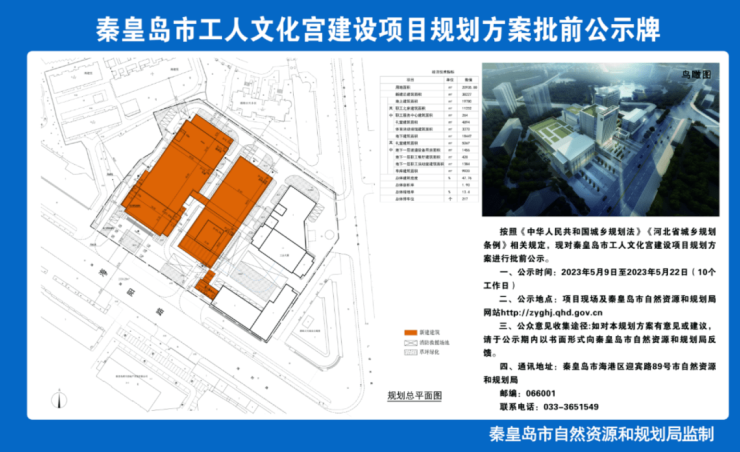 秦皇岛市自然资源和规划局对秦皇岛市工人文化宫建设项目规划方案进行批前公示。