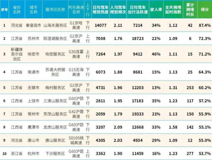 10月25日,中国公路学会和高德地图联合发布了《2023年高速公路服务区出行热度分析报告(1~6月)》,G1京哈高速公路河北秦皇岛段山海关服务区在人均驾车规划频次、日均驾车规划热度、驶入率等方面均名列前茅,以87.4%的总分位居热度第一。