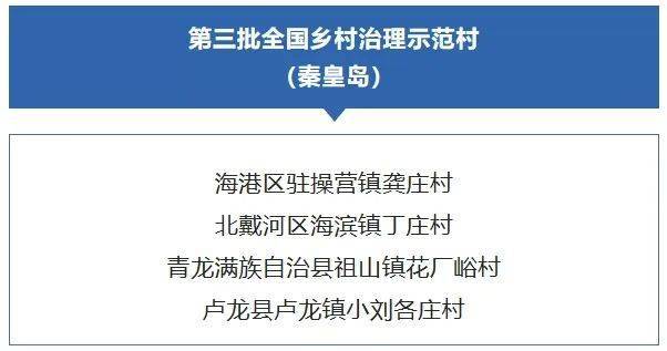 认定北京市大兴区庞各庄镇等100个乡(镇)为第三批全国乡村治理示范乡镇、北京市朝阳区高碑店乡高井村等1001个村为第三批全国乡村治理示范村,其中秦皇岛市4个村入选第三批全国乡村治理示范村,名单如下: